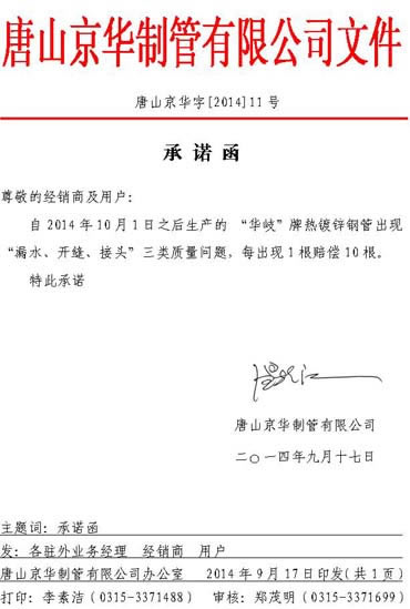 承諾函唐山京華字【2014】11號