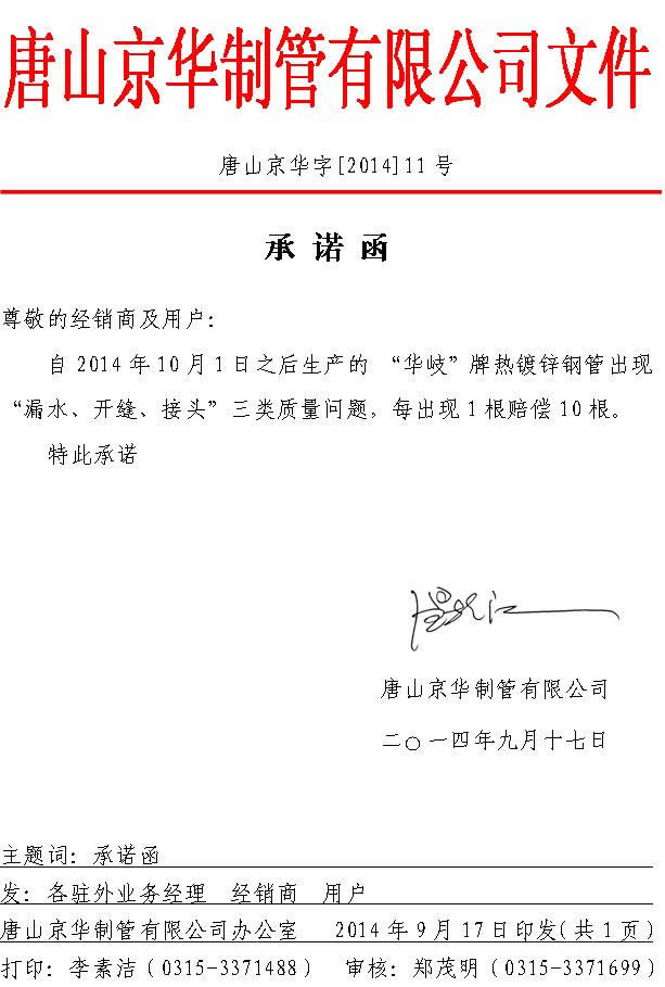 承諾函 唐山京華字【2014】11號