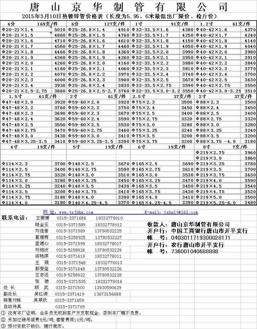 唐山京華2015年3月10日熱鍍鋅管價格表(長度為5.95、6米最低出廠限價、檢斤價) 浙、滬、貴、湘、魯、贛