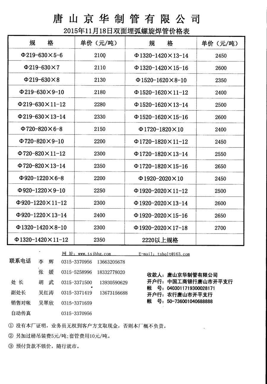唐山京華2015年5月21日焊管價格表(長度為5.95、6米最低出廠限價、檢斤價)