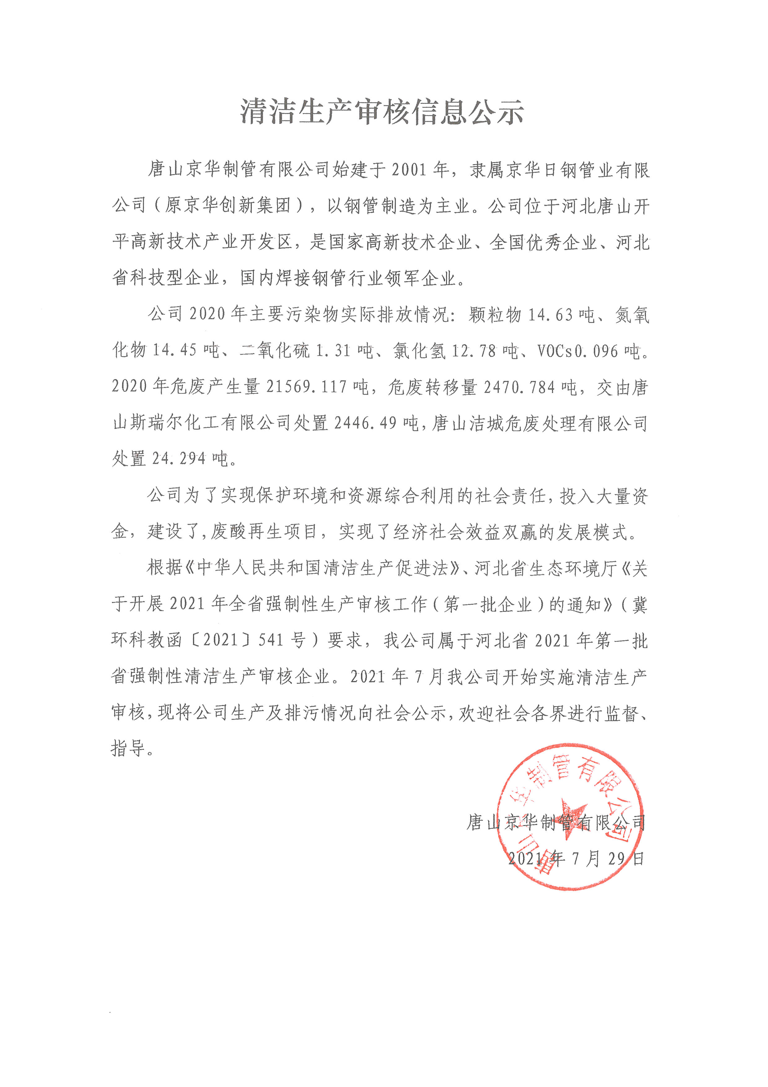 唐山京華制管有限公司清潔生產(chǎn)審核信息公示