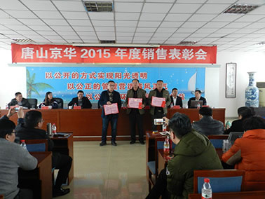 新年伊始,萬象更新!猴年正月十八,唐山京華召開了2015年度銷售表彰大會,會議由銷售部吳紅濤部長主持,公司各部門領導、各區域駐外業務經理及銷售內部服務人員參加。會議在歡樂的氛圍中進行!從市場開發、服務質量以及新產品銷售等方面共評選出11名先進標兵,并頒發榮譽證書。鼓勵大家2016年再接再厲,再創輝煌!供銷副總胡武、銷售部長吳紅濤對2015年公司整體銷售情況進行了總結分析,并對2016年的銷售任務做出了安排。
