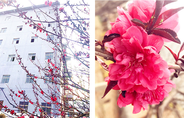 碧桃花嬌俏鮮明,跳著春舞,仿佛在為職工們加油打氣。