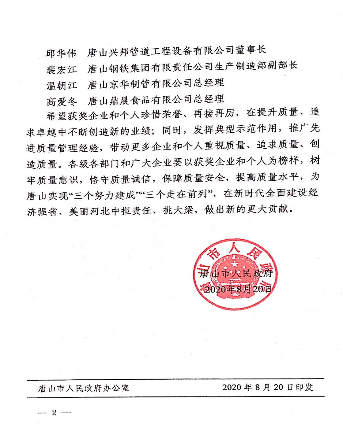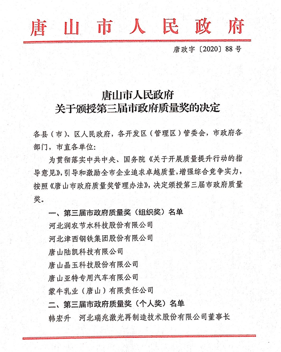 近日,公司總經理溫朝江榮獲第三屆“唐山市政府質量獎” (個人獎),該獎項是唐山市質量領域的最高榮譽獎項,由唐山市政府設立,旨在表彰全市在提高質量方面取得卓越成績的優秀企業及管理人員。
