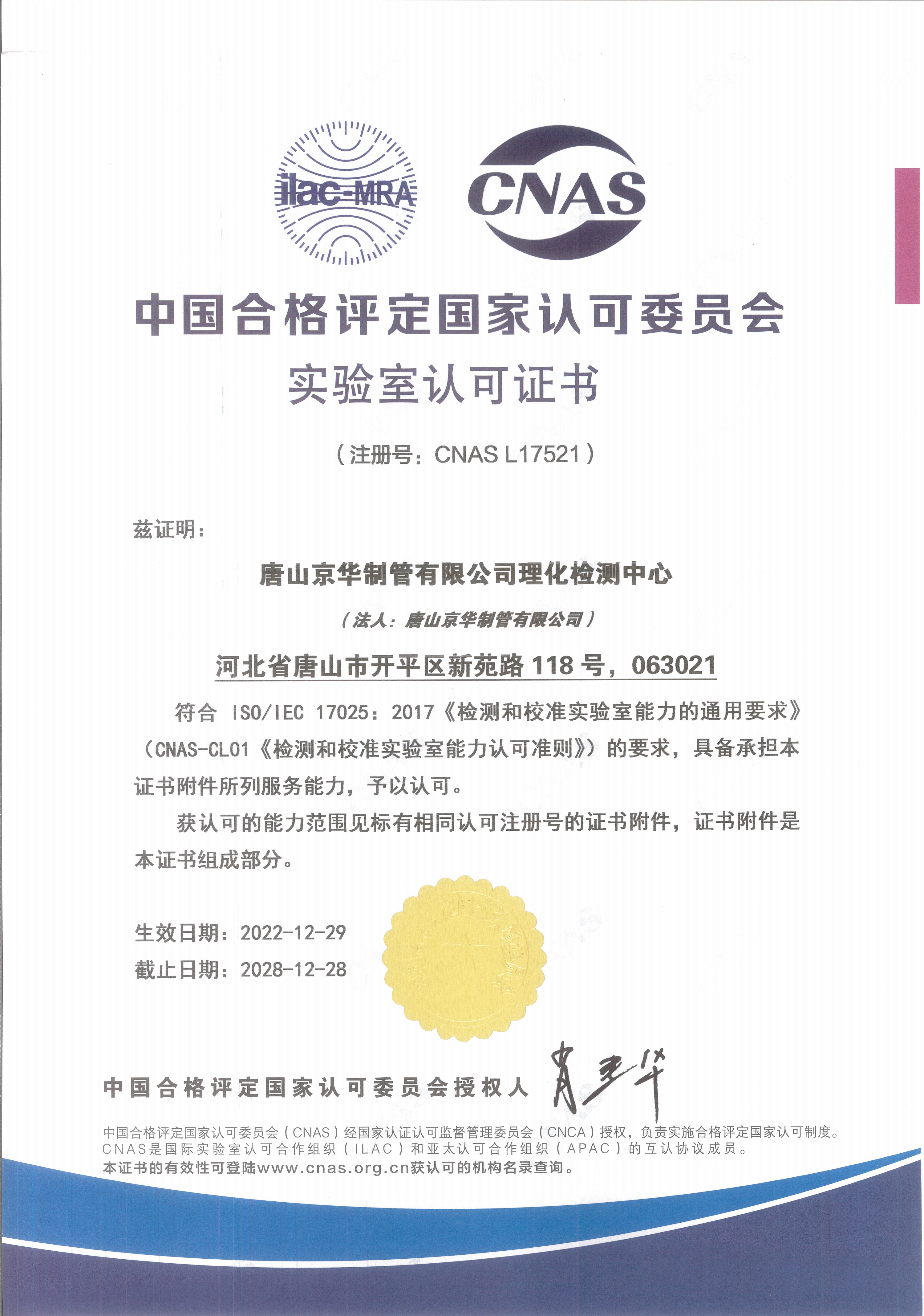 近日,公司理化檢測中心正式通過CNAS實驗室現場評審,獲頒實驗室國家認可證書,表明理化檢測中心具備了按相應認可準則開展檢測和校準服務的技術能力,綜合體現了理化檢測中心的檢驗能力、先進檢測設備、質量管理體系、技術研發實力、專業管理團隊等核心能力,以及在品質管理上突出的競爭力。