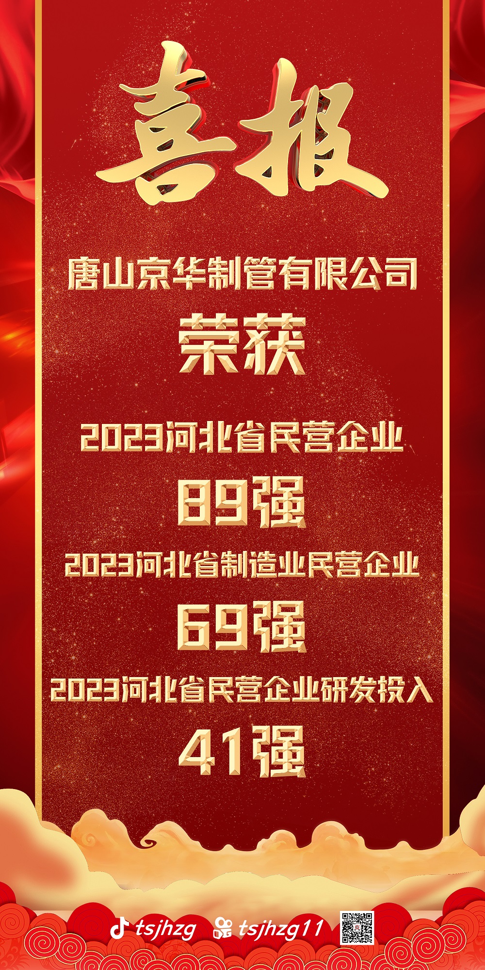 10月27日,“2023河北省民營企業100強”等榜單發布。唐山京華制管有限公司榮登2023河北省民營企業100強、制造業民營企業100強、民營企業研發投入100強榜單。
