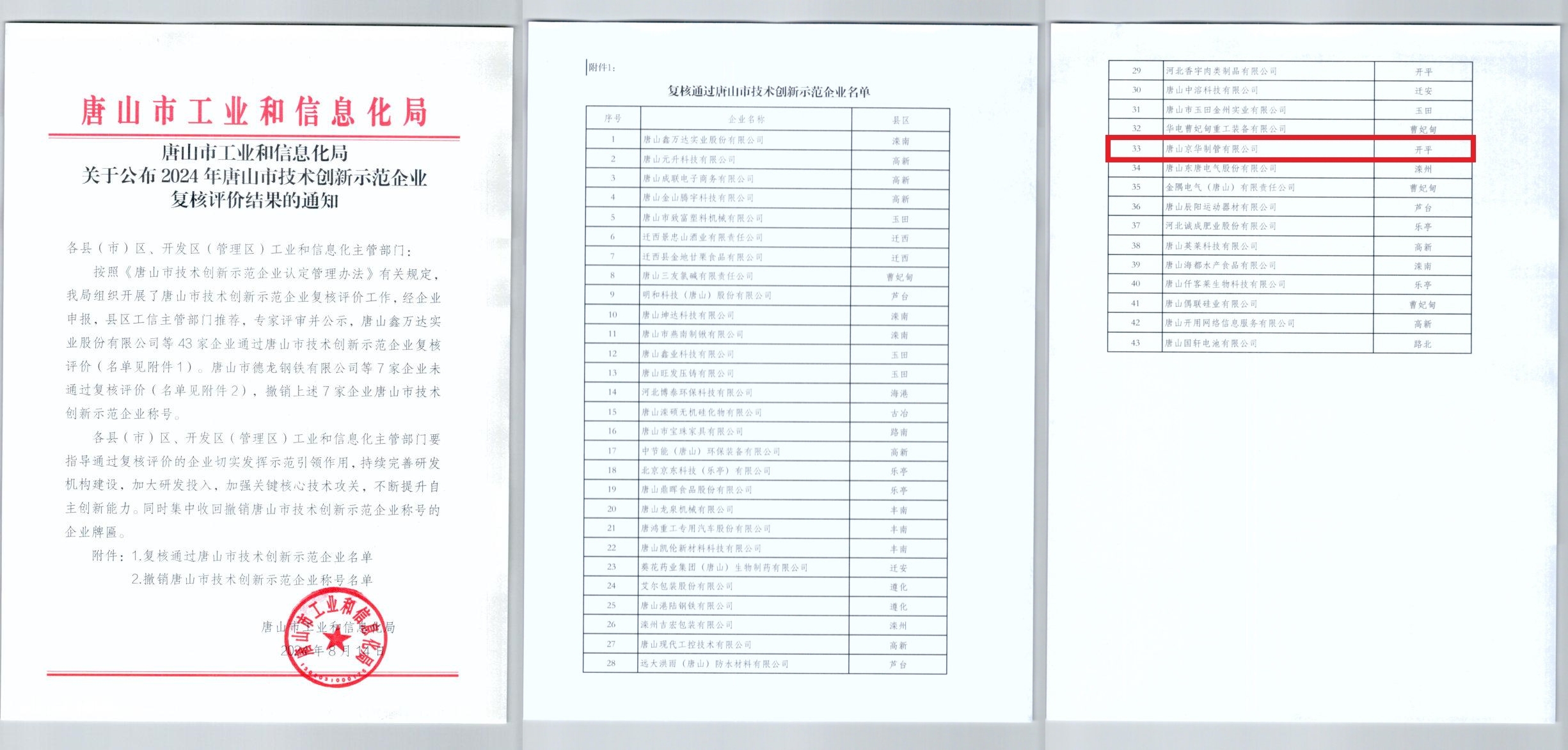 8月14日,唐山京華順利通過唐山市技術創新示范企業復核評價。公司一直致力于以鋼管研發、生產和銷售,目前已成為省內最大的鋼管生產企業之一,確立了“建成一個運轉高效、經營良性、具有產品差異化、客戶優質化,有自己特色、可持續發展的鋼管企業”的發展定位。