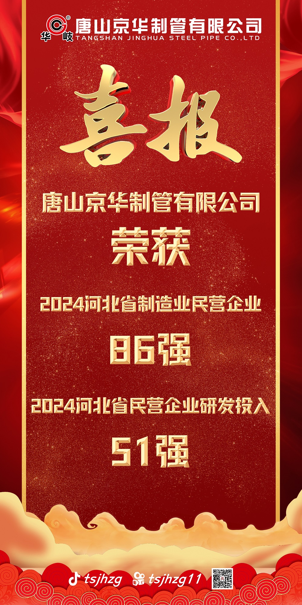 近日,河北省工商聯在承德舉行2024年河北省民營企業100強發布會。唐山京華制管有限公司榮登2024年河北省制造業民營企業100強、民營企業研發投入100強榜單。